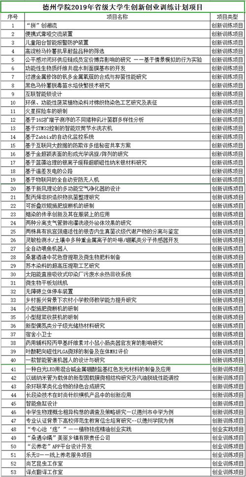 根据《关于申报2019年国家级、省级老员工创新创业训练计划立项项目的通知》(鲁教高处函〔2019〕8号),教育厅组织开展了省级老员工创新创业训练计划项目申报工作,省属本科高校共申报项目6487项,确定面向省属本科高校立项省级老员工创新创业训练计划项目4000项,其中创新训练项目3354项、创业训练项目472项、创业实践项目174项,公司有47项创新训练项目,1项创业实践项目, 5项创业训练项目获批。